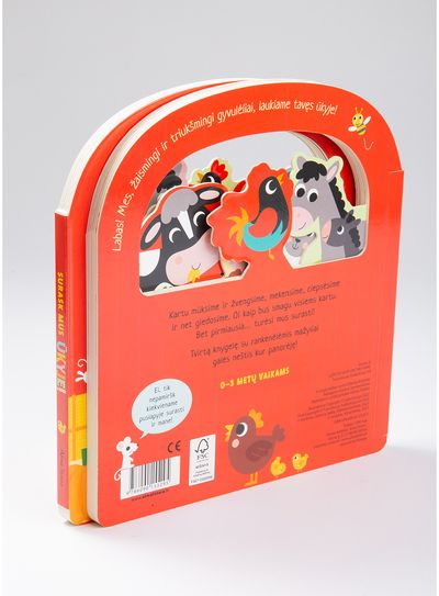 0–3 metų vaikams skirta knygelė – labai smagi pirma pažintis su įvairiais ūkio gyvūnais. Mažylių dėmesį patrauks ryškios ir spalvingos iliustracijos, bus įdomu klausytis skaitomo nuotaikingo rimuoto teksto ir bandyti atkartoti gyvulėlių garsus. Be to, kiekviename puslapyje vaikai turės surasti ir atpažinti aiškiai puslapiuose nurodytus gyvūnus.