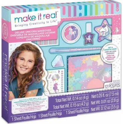 Rinkinį sudaro: vienaragio rago formos kosmetinis akių šepetėlis, 6 spalvų akių šešėliai, skaistalai, 2 mini kosmetiniai šepetėliai, lūpų blizgis, 2 spalvų plaukų kreidelės, kempinėlė, tatuiruočių lapas, kūno blizgučiai, nagų lakas, nagų lipdukai, dildė.