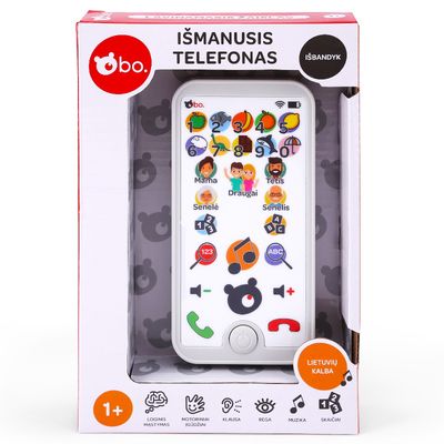 Šis šaunus BO išmanusis telefonas – ne tik smagus, bet ir lavinantis žaislas. Telefonas turi du linksmus ir lavinančius žaidimus, kuriuos žaisdamas mažylis mokysis skaičių ir žodžių, daugybę smagių garso efektų bei po muzikos natos mygtuku besislepiančią lietuvišką dainelę!