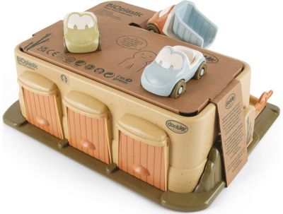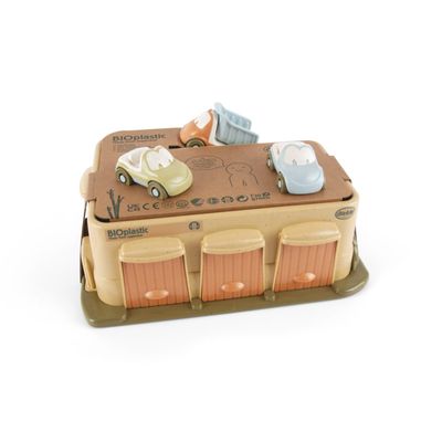 Prislopintų spalvų garažas su čiuožykla ir vieta ant stogo trims mažiems mieliems komplekte priklausantiems automobiliams. Kiekvienas automobilis turi savo parkavimo vietą pakėlus garažo duris. Iš viso 4 atsidarantys vartai, kuro balionėliai ir pakeliamas barjeras. Rinkinį galima žaisti viduje ir lauke. Pravažiavus per smėlio dėžes ar balas, automobilius lengva išvalyti. Garažas taip pat tinkamas plauti indaplovėje, tačiau rekomenduojame daugiau plauti rankomis, kad apsaugotume lipdukus. Be to, rinkinyje yra kartoniniai žaislai, skirti savarankiškai surinkti, pagaminti iš perdirbto kartono, jie gali būti spalvoti. BIO garažas ir jo automobiliai yra pagaminti Danijoje iš BIO plastiko, pagaminto iš cukranendrių, kuris yra 100% tvarus ir todėl sertifikuotas Šiaurės šalių ekologiniu ženklu. Šie žaislai yra draugiški aplinkai ir juose nėra kenksmingų cheminių medžiagų.