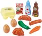 Rinkinyje: kepta vištiena, kiaušiniai, kiaušinių dėžutė, ančiuvis, pyragas, cukinija, morka, du skirtingi padažo buteliai ir dėžutė.